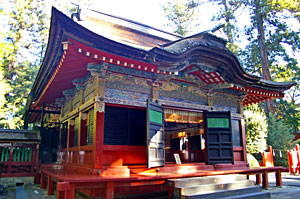 拝殿 唐破風を付けた檜皮葺平入りの拝殿。 極彩色の総漆造りだ。 |
