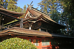 | 本殿 外側は一層に見えるが、内部は二層の 独特な貫前造。上階に神が鎮座し、 下階には2基の神輿を置く。 |