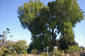 | 宮鍋神社の社叢 静かな住宅地の中にある。 ひときわ目を引く巨木が、この神社の ただならぬ由緒を物語るようだ。 |