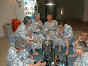 手前左は村田氏、奥の左から川俣氏、金子氏、戸田氏、 北垣氏。右の手前は篠崎氏、佐藤氏。 北垣氏は切腹の直後にもかかわらず、平気で酒を飲むの で、みんなハラハラ。翌年10月死去。 |