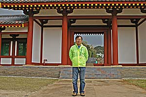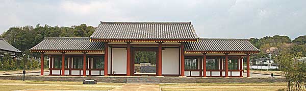 | 復元された国分尼寺中門 古代遺構の上に復元された。国産のヒノキ材を使い、古代と同じヤリガンナで仕 上げている。朱塗りの柱と緑の連子窓が美しい。連子窓を有する回廊は複式回廊 で内側、外側両側を通れる贅沢な回廊であった。 |