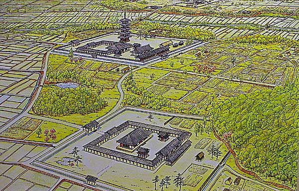 | 三河国分寺(奥)と国分尼寺(手前)のイメージ図(三河天平の里資料館) |