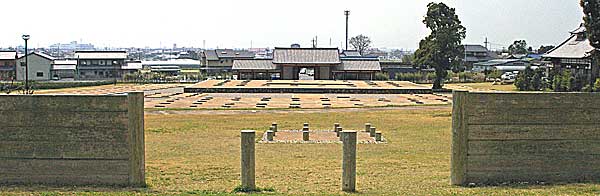 | 三河国分尼寺史跡公園全景 尼房、講堂、金堂、中門が見渡せる。手前の板塀も寺域を囲んだ塀の復元である。 寺域は150m四方で、周囲を板塀で囲んである。 |