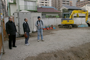 説明を聞く久保田氏 発掘に携わった人から説明を聞く久保田氏。 2005年2月13日。 |
