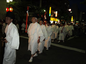 | 白装束の各宮の先触れ 警固と書かれた烏帽子に、一ノ宮から六ノ宮、御本社と書かれた提灯を捧げながら先導する。半七捕物帖に描かれた「暗闇の中を白丁の足音がしとしとと聞こえるばかり、、、」という描写に近いかもしれない。 |