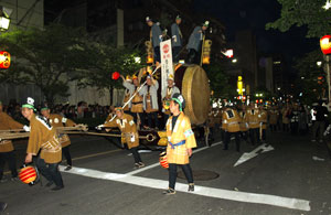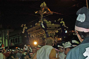 6時の花火を合図に、まずは先導の大太鼓が5基、ドーン、ド−ンと腹に響く音を轟かせながら曳かれていく。直径3Mはありそうな大太鼓の上には、長い提灯を持った人たちが5、6人乗っている。「オンライ」、「オンライ」とかけ声を掛けながら提灯を上下させる。それに合わせて、ドーン、ドーンと撥がなる。そしていよいよ神輿の渡御だ。烏帽子をかぶった若者達が、1トン以上はあろうかという神輿を担いで、夜の甲州街道を御旅所まで、練りに練って勇壮に担ぎ込む。 |
