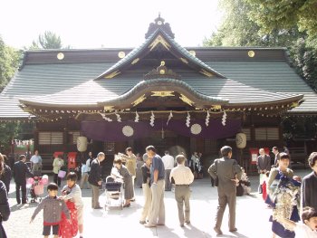 | 七五三で賑わう拝殿前 中央の社殿に主祭神の大国魂大神、 東に小野、小河、氷川、 西に秩父、金佐奈、杉山の諸神を祀る。 |
