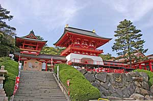| 忌宮神社神門 境内は広々としており、どことなくのどかな雰囲気だ。 仲哀天皇二年(193)熊襲征討のため、この地穴門(長門)の豊浦(とゆら)に宮を営む。天皇はこの宮に神功皇后とともに7年間住まわれたと伝えられている。 |