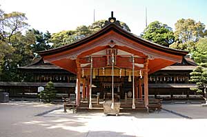 拝殿 天文八年(1539)毛利元就の建立。檜皮葺切妻造。国の重要文化財。 |
