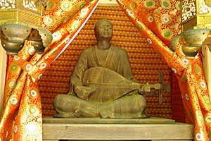 耳無し芳一の像 小泉八雲の小説で有名な琵琶法師。 平家一門の墓域の前の小堂にある。 いまでも、平家の公達に平家物語の哀切を語っているのであろうか。 |
