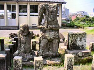 | 大隅国分寺跡は、祓戸神社とJR国分駅を挟んで反対側にある。青年会議所の敷地の中に六重の石塔と、妙な石像があった。 明治の廃仏毀釈で、鹿児島県にはめぼしい仏寺はほとんど無いが、国分寺はいつ頃から無くなってしまったのだろう。関ヶ原の敵陣突破で勇名をはせた島津義久は、慶長九年(1604)にこの地、国分に隠居し舞鶴城を築城するが、その際、町並みを一新するために、古い道路、社寺を徹底的に破壊し、今日の町並みに造り直したという。この時、古代の遺跡はすべて烏有に帰し、寺の礎石は城の石垣や武家屋敷の土台にされたという。この、町並み改造といい、廃仏毀釈といい、タリバンによるバーミヤン大仏の破壊を、一方的に暴挙だと非難できない過去を、我々も持っているのだなあと思った。 |