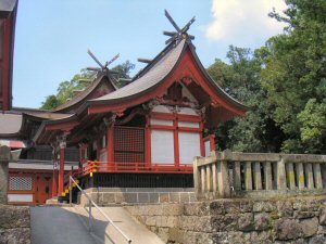 | 拝殿の前にある勅使殿 九州に多い形式で、勅使殿の奥に舞殿、 拝殿、本殿が並び、回廊で結ぶ。 |