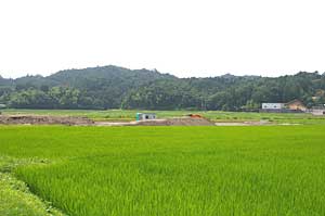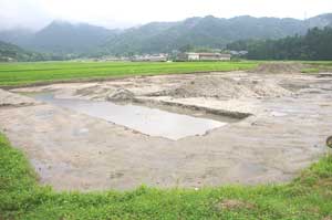 | 紫香楽宮の遺構は、宮町と呼ばれる集落の田んぼの中から発掘された。かなりの突貫工事であったらしく、低地を埋め立てるのに木の根や、雑木を埋め込んだらしく、それが建物の構築用に溝を掘るときに邪魔になり、再度切断した痕跡が出てきたという。 |