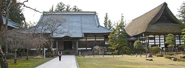 | 本堂と庫裡 正面が本堂、右の茅葺きの建物が大黒柱を持つ庫裡。江戸末期の建築である。 |
