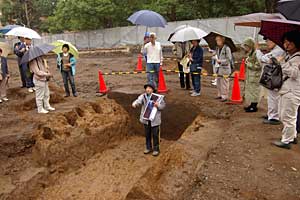 | 大きな溝 国衙域を区画する溝か。雨にも拘わらず 熱心に説明を聞く歴史愛好家たち。 |