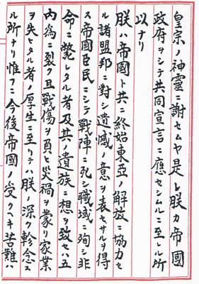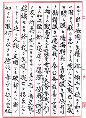 するに出て、他国の主権を排し領土を侵すが如きは固(もと)より朕が志にあらず。然るに交戦己(すで)に四歳を閲(けみ)し、朕が陸海将兵の勇戦、朕が百僚有司の励精、朕が一億衆庶の奉公、各ゝ最善を盡せるに拘らず戦局必ずしも好転せず。世界の大勢亦我に利あらず。加之(これにくわえ)敵は新に残虐なる爆弾を使用し、頻(しきり)に無辜(むこ)を殺傷し、惨害の及ぶ所、真(まこと)に測るべからざるに至る。而も尚、交戦を継続せむか、終に我が民族の滅亡を招来するのみならず、延(のべ)て人類の文明をも破却すべし。斯くの如くむば、朕何を以てか億兆の赤子を保し、皇祖皇宗の神霊に謝せむや。是れ朕が帝国政府をして共同宣言に応ぜしむるに至れる所以なり。 朕は帝国と共に終始東亜の解放に協力せる諸盟邦に対し、遺憾の意を表せざるを得ず。帝国臣民にして戦陣に死し、職域に殉じ、非命に斃(たおれ)れたる者、及其の遺族に想を致せば五内為に裂く。且戦傷を負ひ災禍を蒙り家業を失ひたる者の厚生に至りては、朕の深く軫念(しんねん)する所なり。惟(おも)ふに今後帝国の受くべき苦難は |