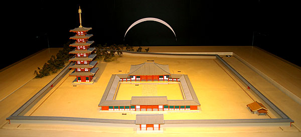 | 但馬国分寺復元模型 南門、中門、金堂が南北一直線に並び、中門と金堂を回廊で囲み、その外に塔を配する典型的な国分寺様式。 (但馬国府・国分寺館蔵) |