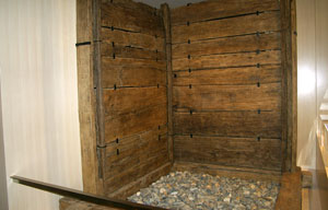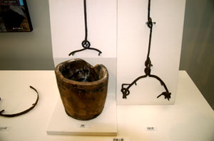 釣瓶と鎖 釣瓶は松をくりぬいて作ってある。 井戸の底から出てきた。 |