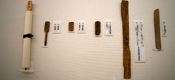 | 祢布ヶ森遺跡から出土した木簡 巻物の内容を表した題籤軸、荷物に付ける付札、文字を練習した習書など多様な木簡が多数出土した。題籤軸には、死亡や逃亡者を記録した死逃帳や、税や口分田の関する書類に、朝来、気多、二方、養父など但馬国の郡名が記されていて、但馬国の各郡の帳簿がここに集められていたことがわかる。この地が但馬国府であったろうと推測される証拠である。年号が記された木簡も見つかり、天長、承和、寛平と、いずれも9世紀の年号が記されていることから、前述の高田郷に遷された但馬国府であることがわかる。円山川の湿地帯にあたるため、土中の水分によって劣化が抑えられ、比較的良好な状態で出土している。 |