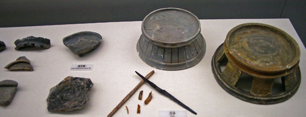 | 風鐸と水煙 塔の相輪に吊り下げられた風鐸(左) 相輪の上部を飾った水煙の断片(右) ほぼ完全な形で出土した風鐸は珍しい。 風が吹くと澄んだ音がしたのでしょうか。 |