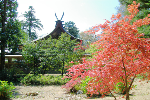 | 本殿 見事な流れ造りの本殿。反り返った千木が珍しい。四月というのに美しく紅葉した 紅枝垂(べにしだれ)が素晴らしかった。 |