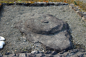 国分寺の礎石 但馬国分寺南大門の礎石。伊能忠敬の測量日記によると、文化11年(1814)には3個の礎石が残っていたという。 |