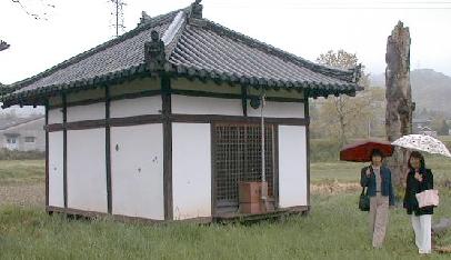 | 山城国分寺は恭仁京の跡を利用して造られた。従って、ここは恭仁京跡でもあり、山城国分寺跡でもあるわけだ。続日本紀の天平18年(746)に恭仁京大極殿を施入し、国分寺と為すとの記事が見える。 国分寺金堂とされた恭仁京の大極殿は、基壇の東西53メートル、南北28メートル。建物は9間、4間の大きなものであった。 下の写真は唯一残る薬師堂。同行の姫たちにもご登場願った。 左が大室さん、右が秋田さんである。 |